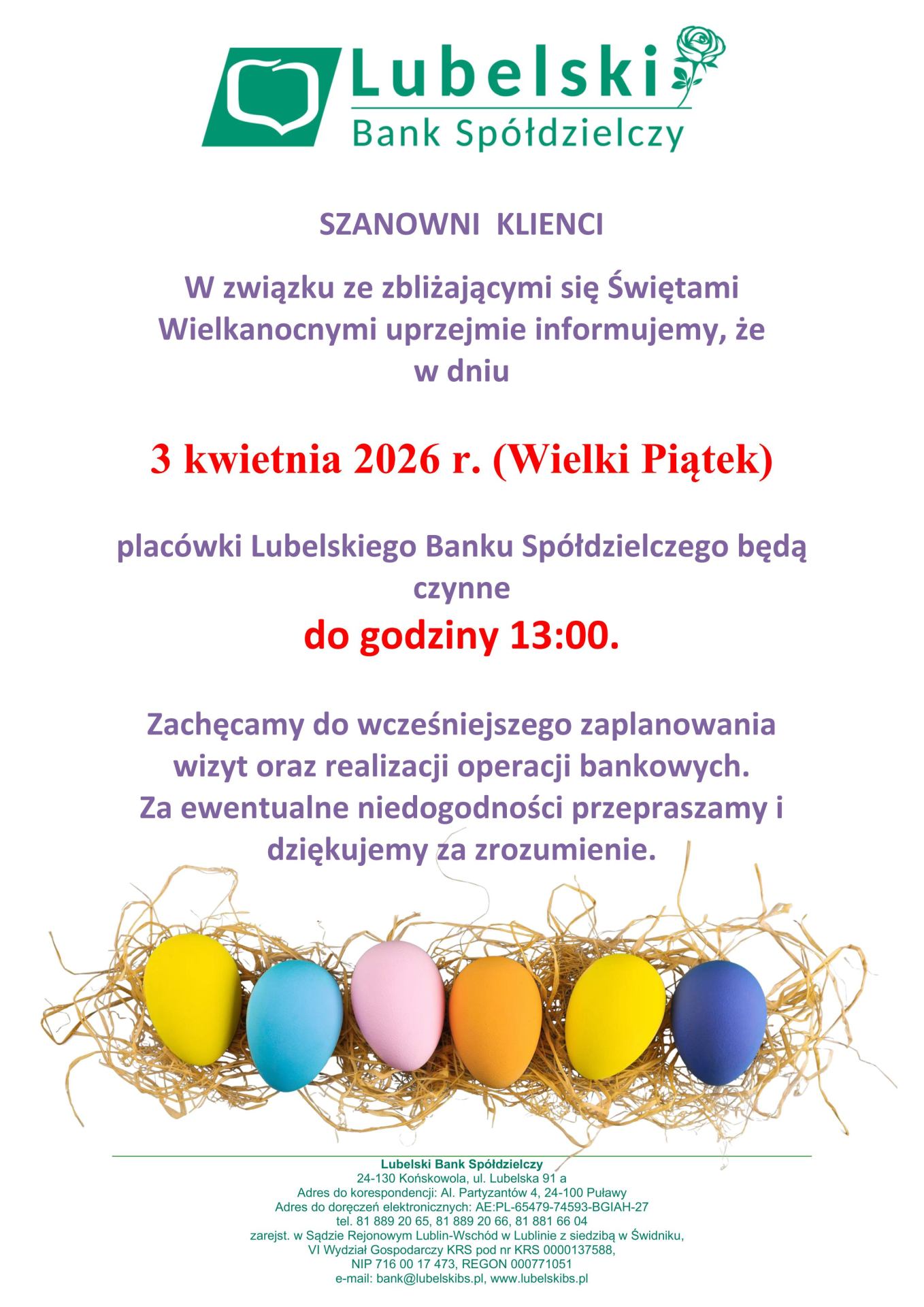 Lubelski Bank Spółdzielczy informuje, że w dniu 3 kwietnia 2026 r. (piątek) godziny pracy naszych placówek zostają skrócone do godziny 13:00.